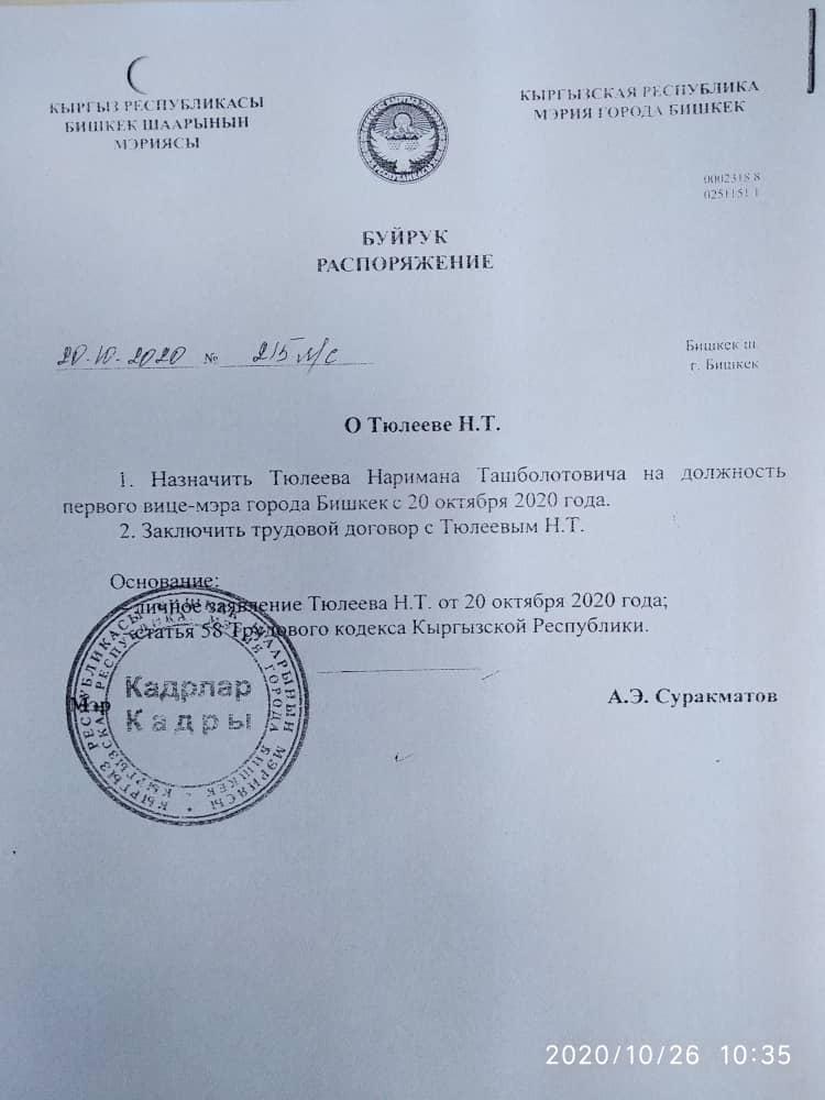 По ее данным, его на законных основаниях назначил экс-мэр Азиз Суракматов, чья отставка была принята и. о. президента КР премьер-министром КР Садыром Жапаровым 21 октября 2020 года.