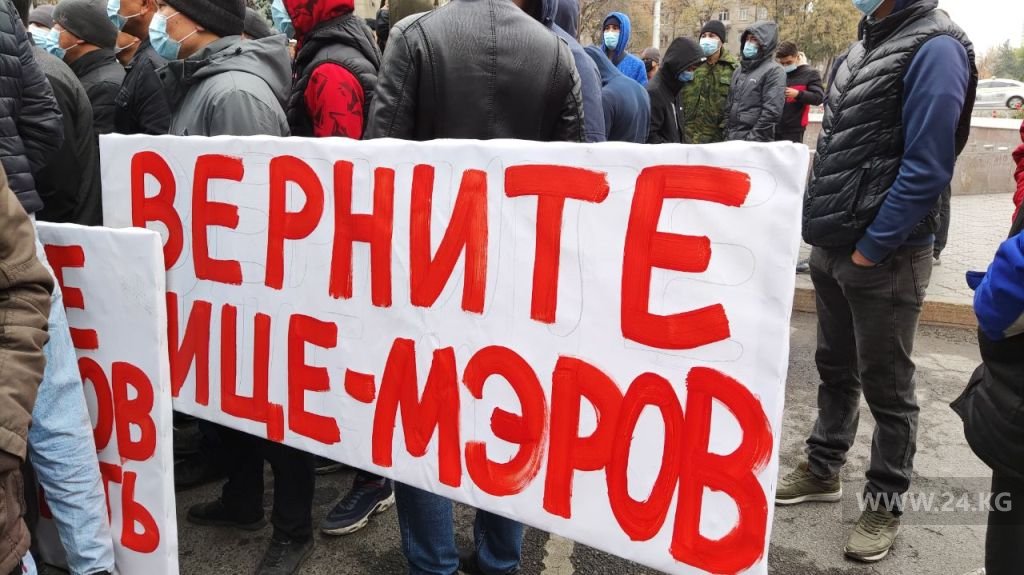 Возле здания мэрии Бишкека снова митинг. Около 70 человек вышли к зданию муниципалитета с требованием вернуть вице-мэров, которых уволили вчера.