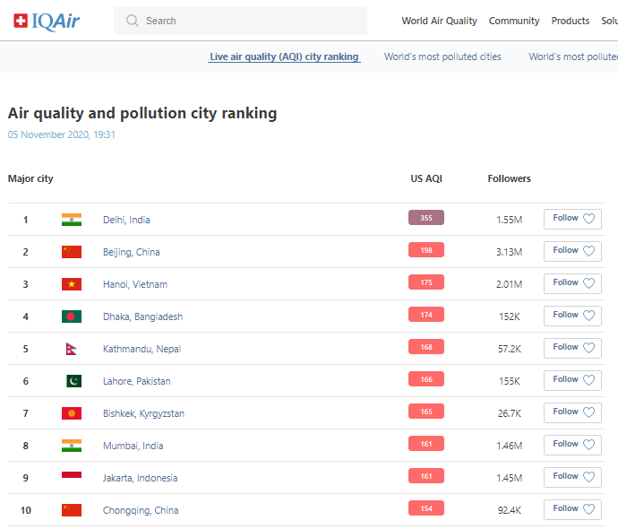 В рейтинге крупнейших городов мира по качеству воздуха World Air Quality на 8.30 Бишкек находится на 7-м месте.