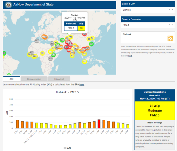 Посольство США в Кыргызстане также установило датчик. Он показывает индекс качества воздуха в режиме онлайн. Информация обновляется ежечасно.