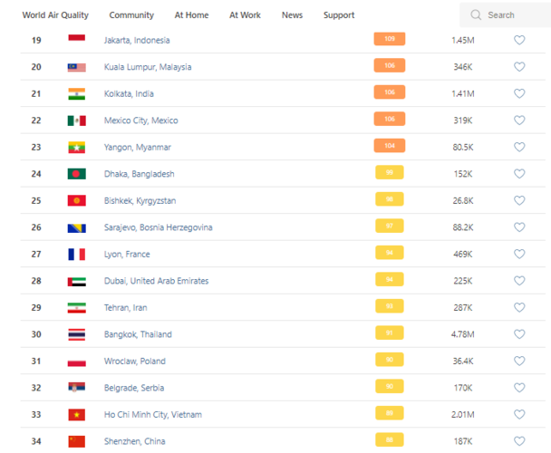 В рейтинге крупнейших городов мира по качеству воздуха World Air Quality на 19.30 Бишкек опустился на 25-е место.