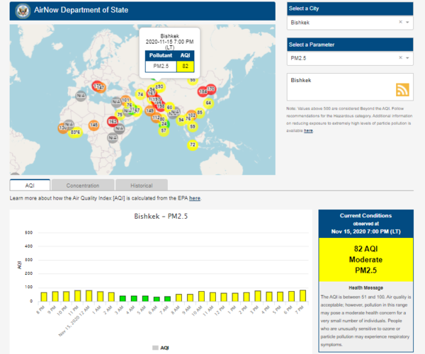 Посольство США в Кыргызстане также установило датчик. Он показывает индекс качества воздуха в режиме онлайн. Информация обновляется ежечасно.