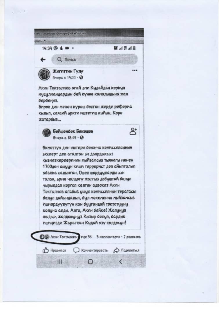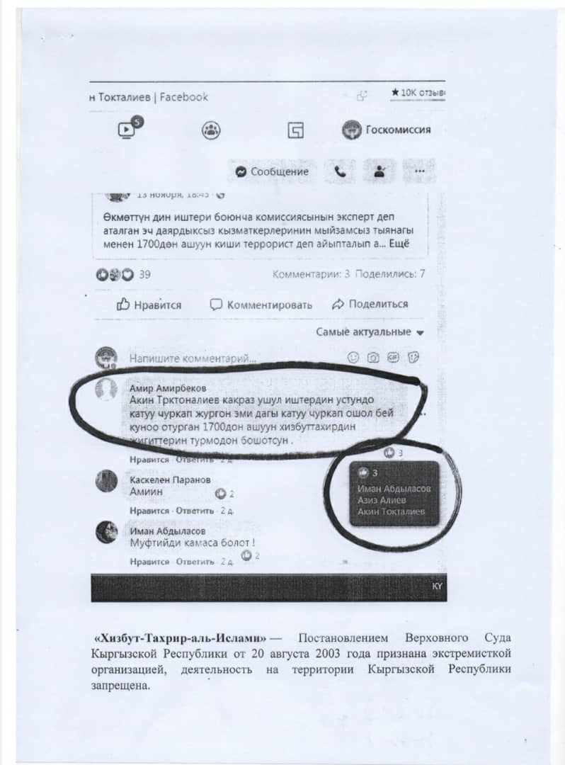 Коллектив комиссии обеспокоен поведением Акина Токталиева в социальных сетях. По их данным, он продолжает поддерживать призыв в содействии освобождению осужденных членов экстремистской организации «Хизб ут-Тахрир» из тюрем.