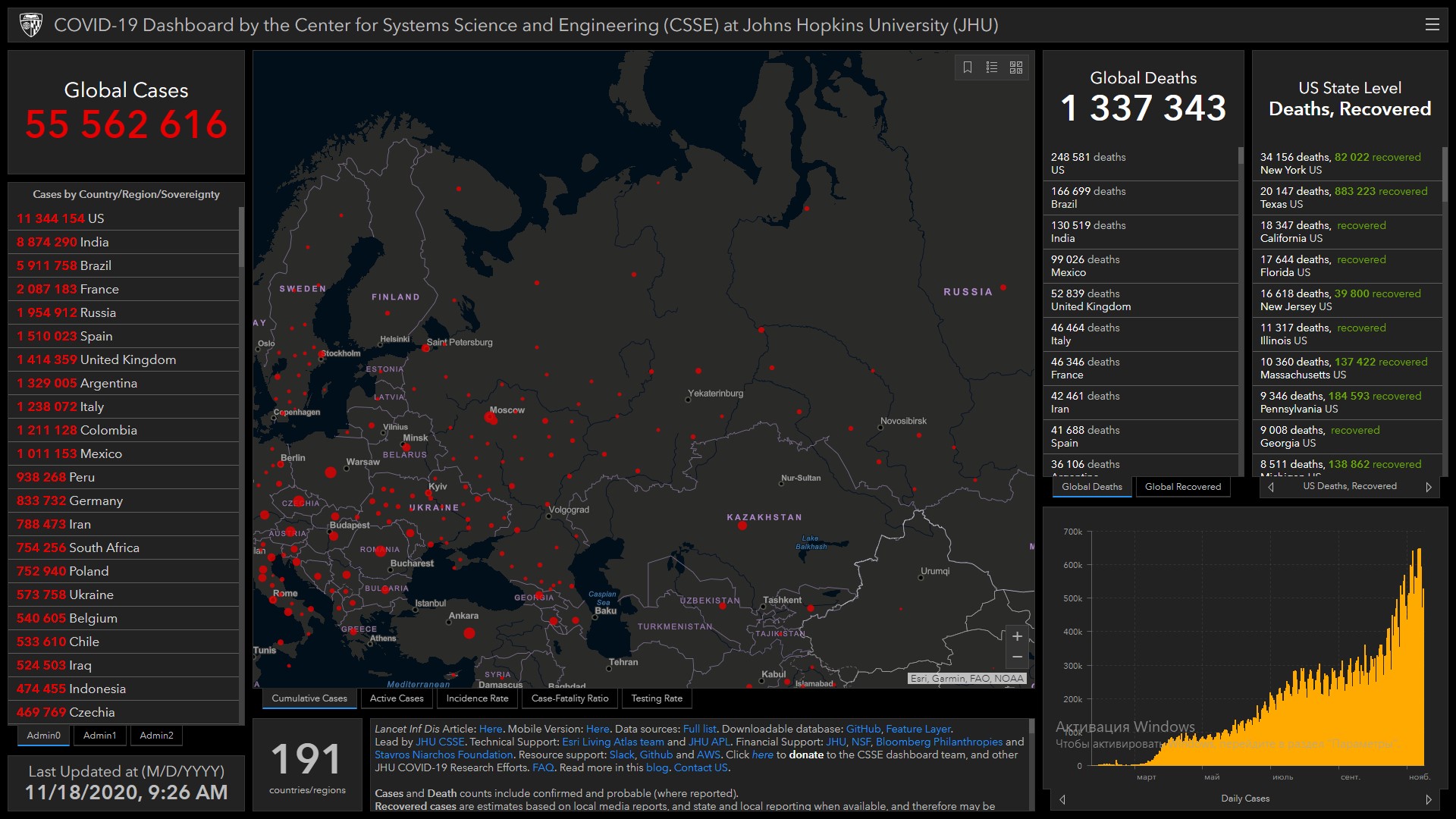 Всего в мире коронавирусом заразились 55 миллионов 562 тысячи 616 человек. Больше всего зараженных в США (11 миллионов 344 тысячи 154), Индии (8 миллионов 874 тысячи 290), Бразилии (5 миллионов 911 тысяч 758), Франции (2 миллиона 87 тысяч 183), России (1 миллион 954 тысячи 912), Испании (1 миллион 510 тысяч 23), Великобритании (1 миллион 414 тысячи 359), Аргентине (1 миллион 329 тысяч 5), Италии (1 миллион 238 тысяч 72) и Колумбии (1 миллион 211 тысяч 128).