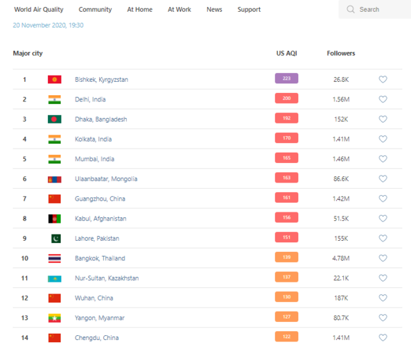 В рейтинге крупнейших городов мира по качеству воздуха World Air Quality на 19.30 Бишкек поднялся на 1-е место.