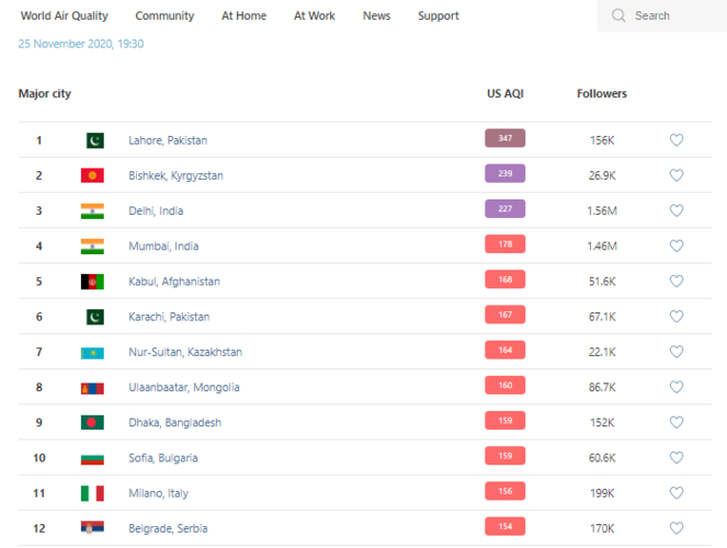В рейтинге крупнейших городов мира по качеству воздуха World Air Quality на 19.30 Бишкек поднялся на 2-е место.