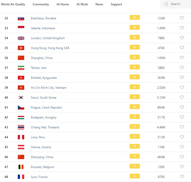 В рейтинге крупнейших городов мира по качеству воздуха World Air Quality на 8.30 Бишкек находится на 38-м месте.