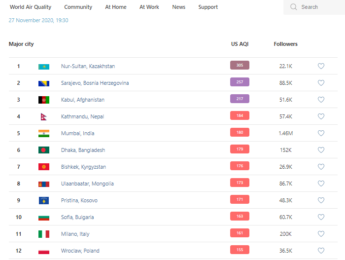 В рейтинге крупнейших городов мира по качеству воздуха World Air Quality на 19.30 Бишкек поднялся на 7-е место.
