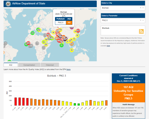 Посольство США в Кыргызстане также установило датчик. Он показывает индекс качества воздуха в режиме онлайн. Информация обновляется ежечасно.