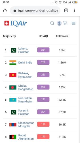 В рейтинге крупнейших городов мира по качеству воздуха World Air Quality на 19.30 Бишкек поднялся на 3-е место.