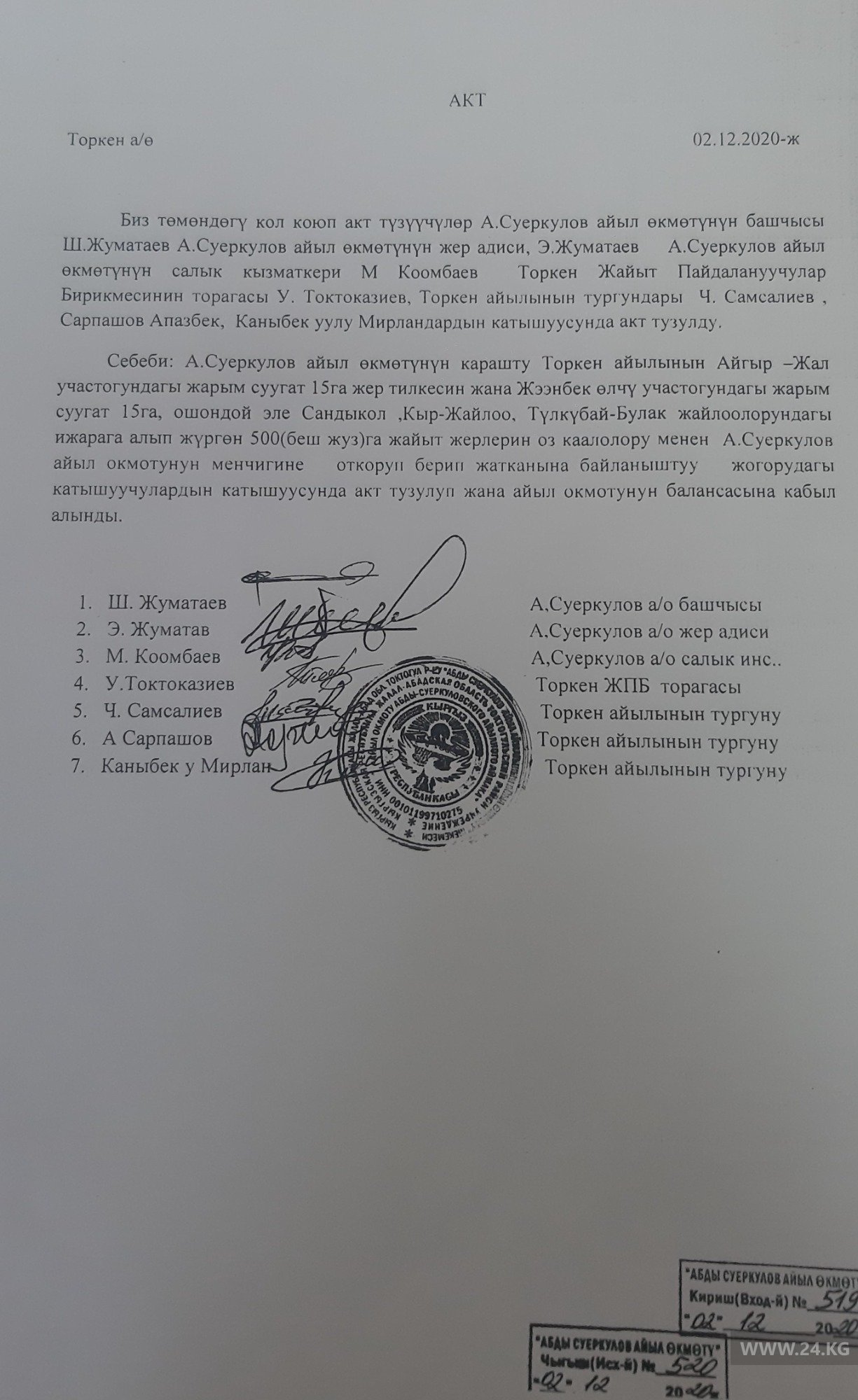 Уточняется, что Тайырбеком Сарпашевым ранее были приобретены земли в Торкенском айыл окмоту Токтогульского района.