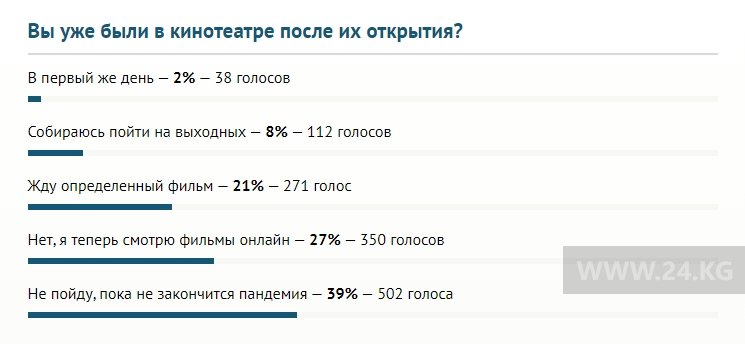 Читатели 24-kg.com не планируют идти в кино до окончания пандемии COVID-19. Об этом заявили 502 человека, или 39 процентов принявших участие в опросе. На втором месте по количеству голосов респонденты, которым не нужны кинотеатры, потому что они привыкли смотреть фильмы онлайн. Таких 350 человек, или 27 процентов участников голосования.