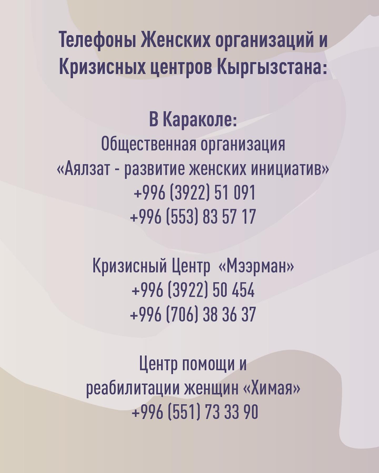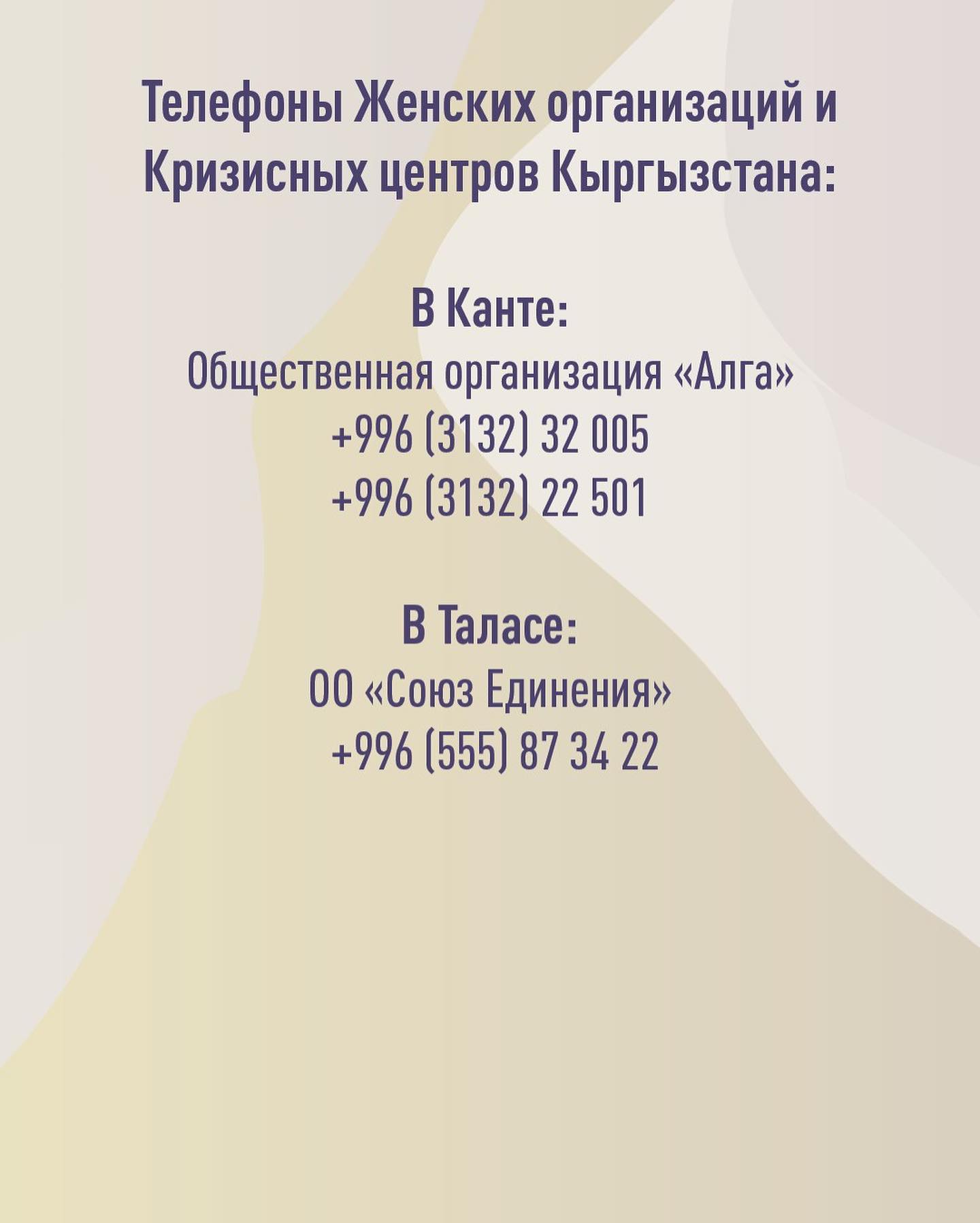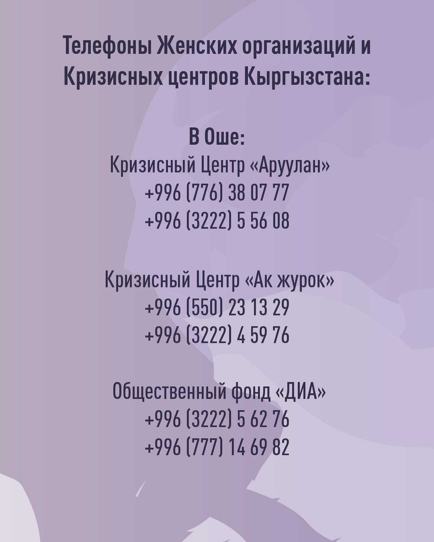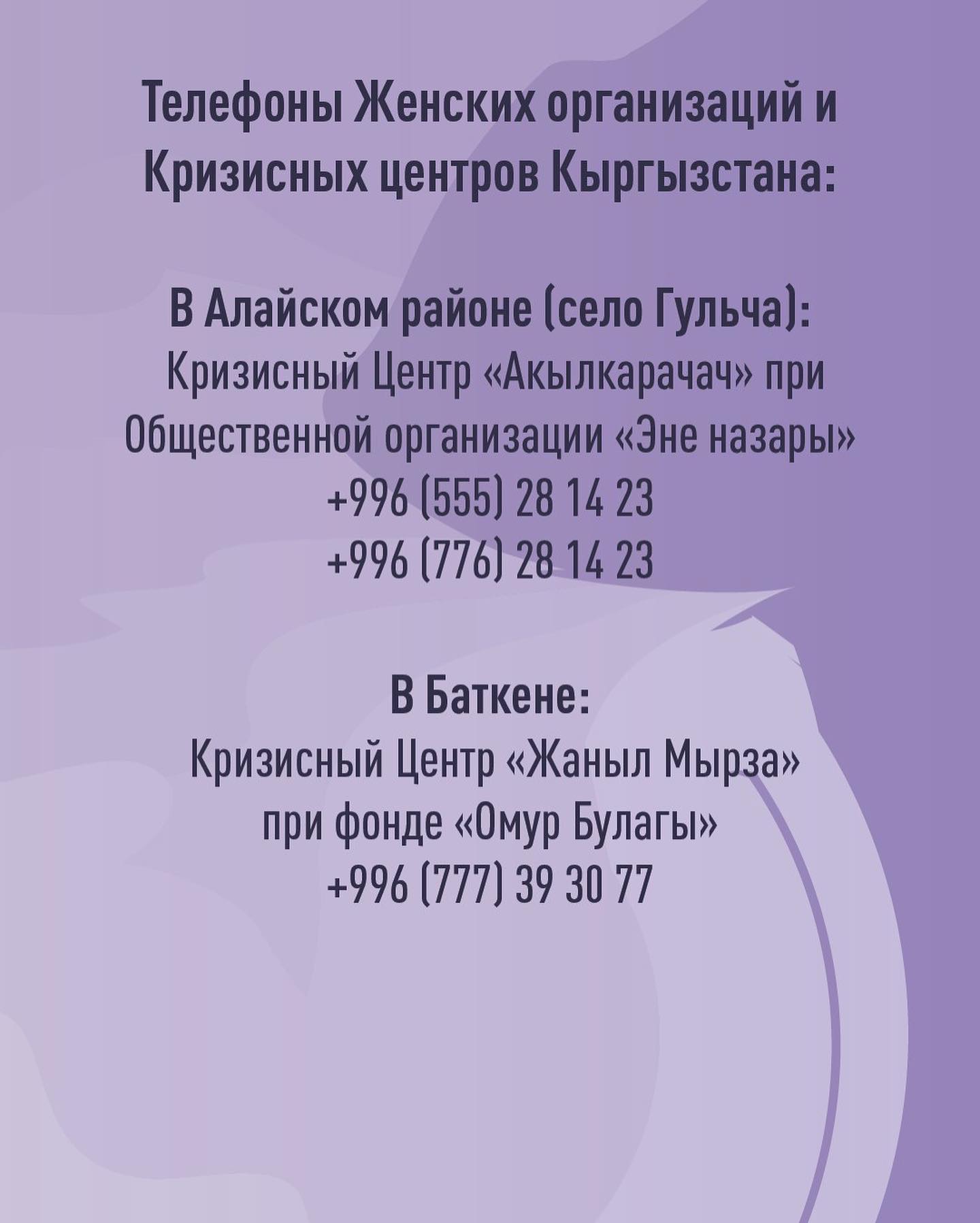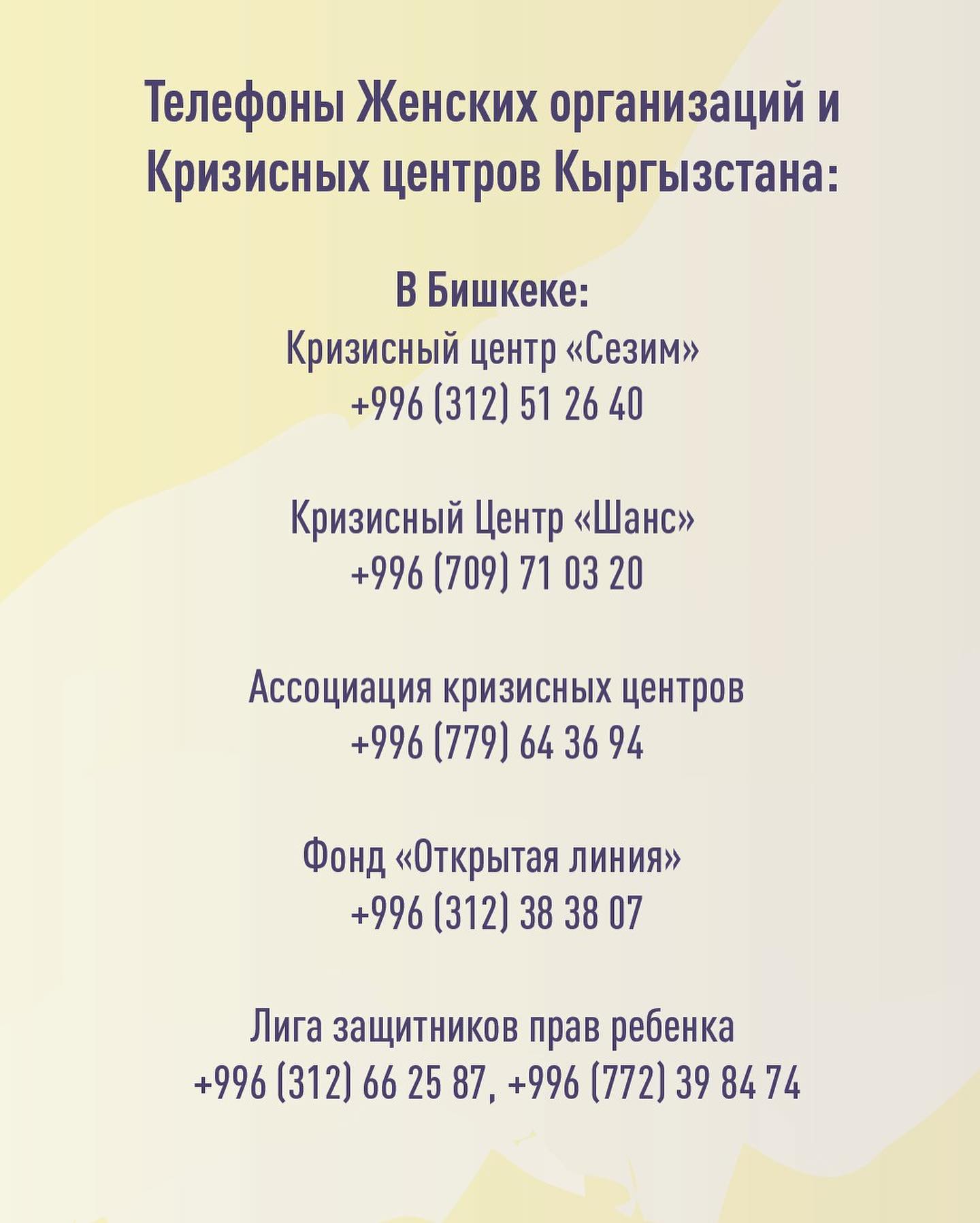 Ниже представлены контакты общественных организаций и кризисных центров Кыргызстана.