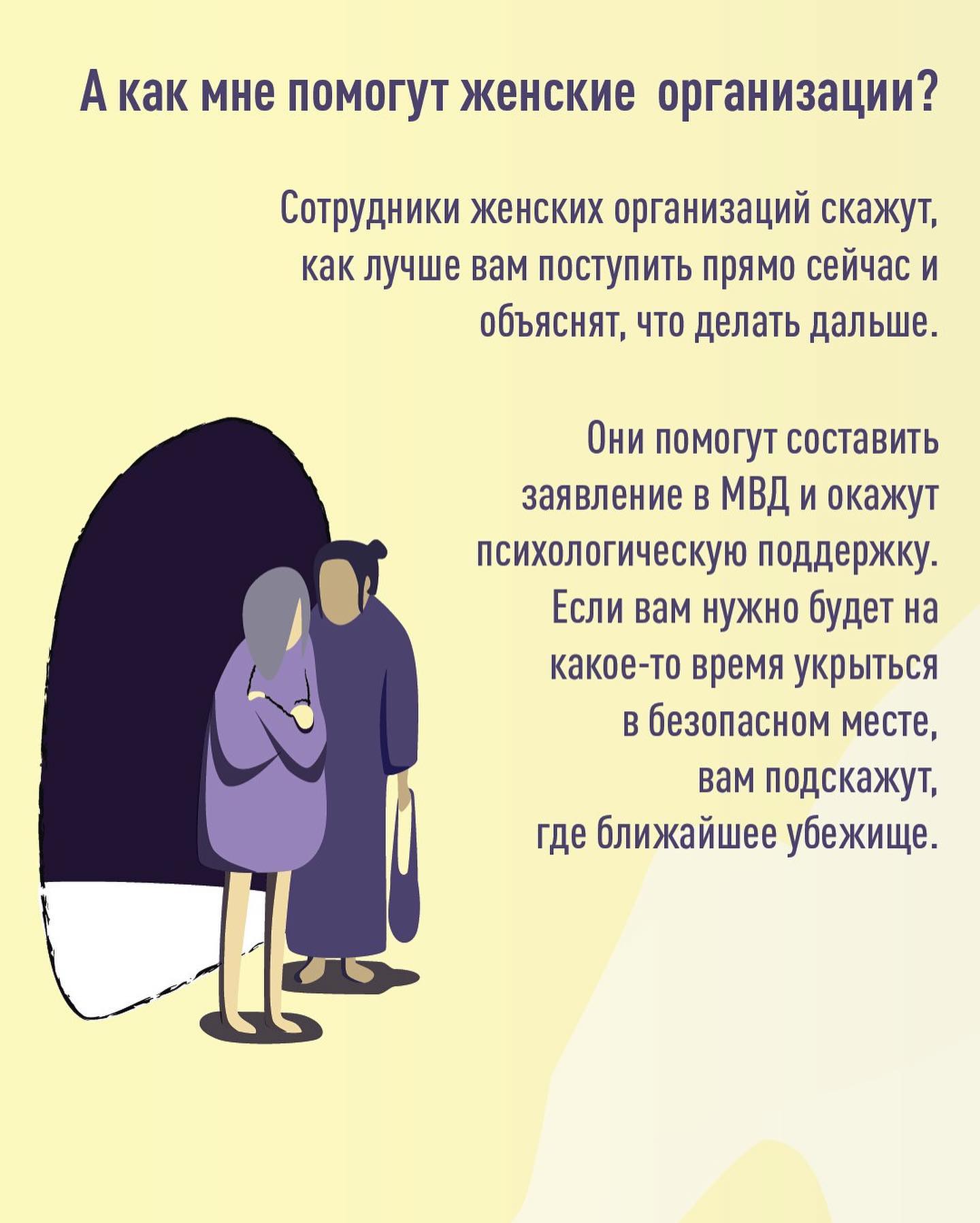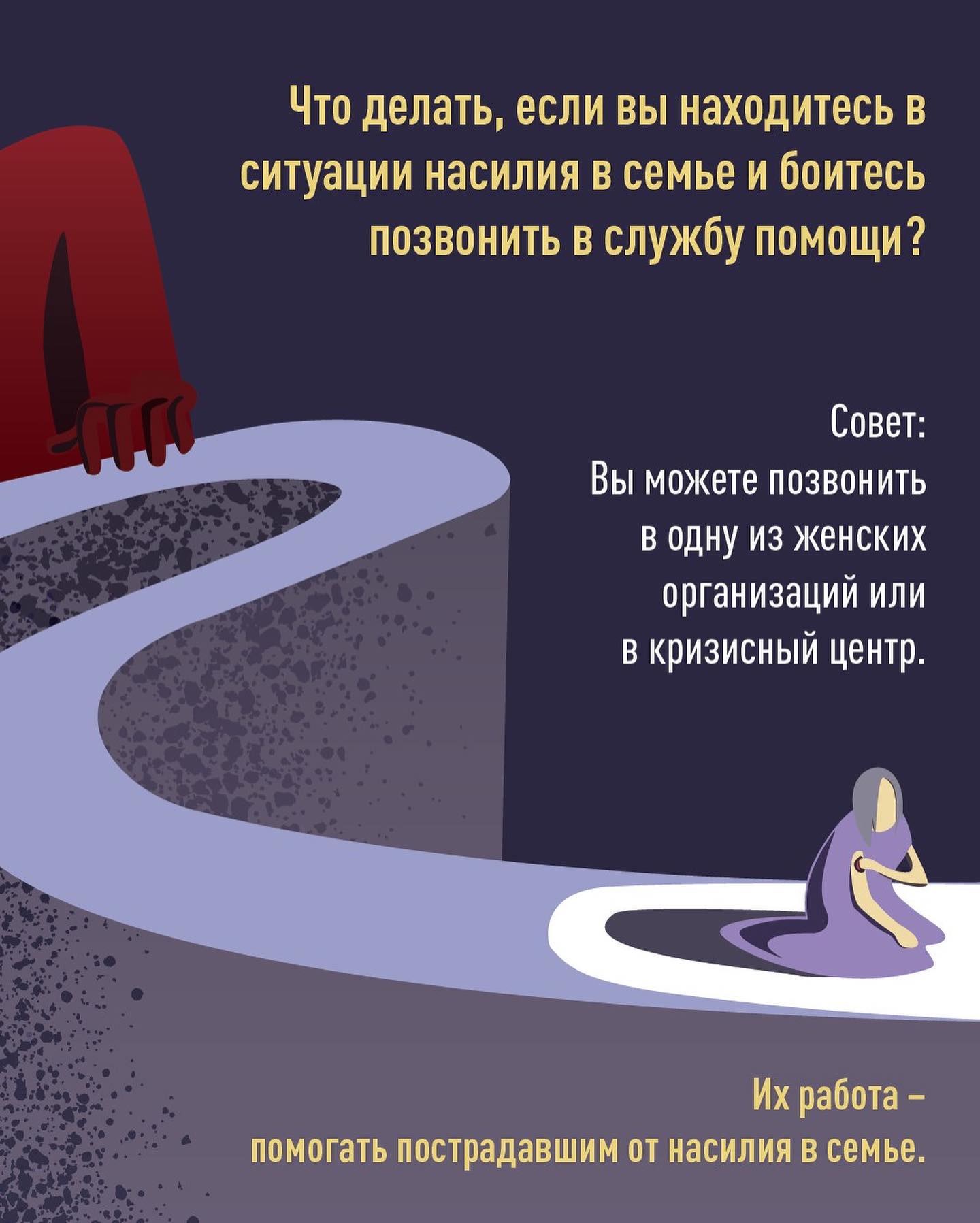 По словам представителей организации, если вы находитесь в ситуации насилия в семье и боитесь позвонить в службу помощи, то вы можете позвонить в одну из женских организаций или в кризисный центр.