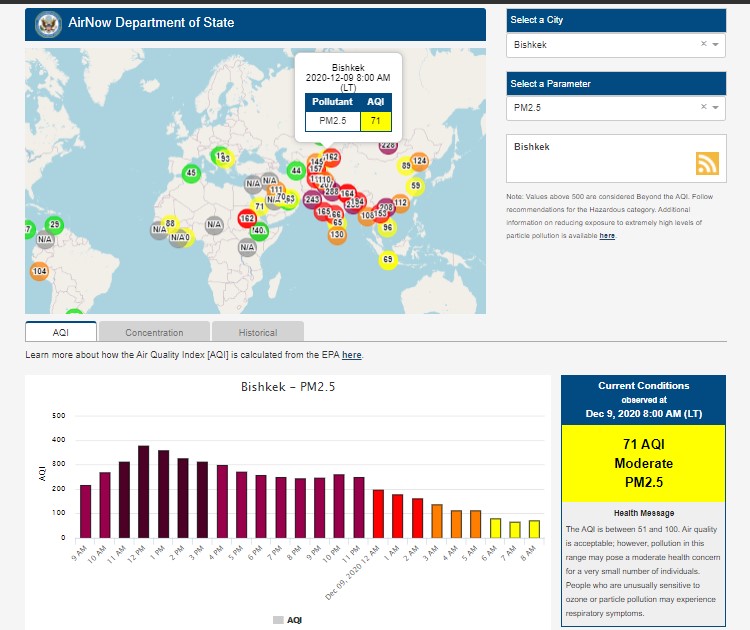 Посольство США в Кыргызстане также установило датчик. Он показывает индекс качества воздуха в режиме онлайн. Информация обновляется ежечасно.