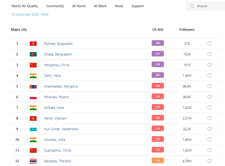 В рейтинге крупнейших городов мира по качеству воздуха World Air Quality Бишкек вновь находится на первом месте.