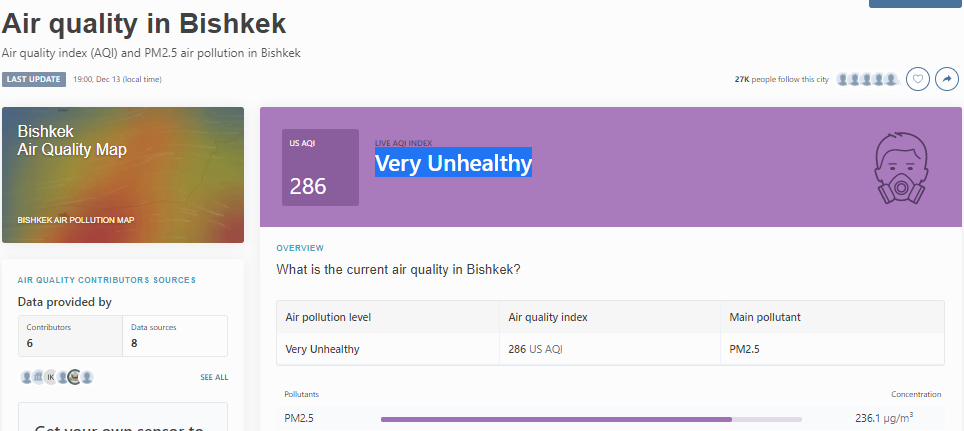 В 19.30 статус города отмечен как «очень нездоровый» (Very Unhealthy). Индекс качества воздуха, по данным сайта, составляет 286 (AQI), а замеры концентрации мелких частиц PM2.5 показали 236,1 мкг/м³.