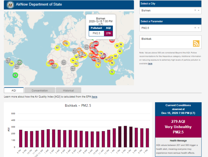 Посольство США в Кыргызстане также установило датчик. Он показывает индекс качества воздуха в режиме онлайн. Информация обновляется ежечасно.