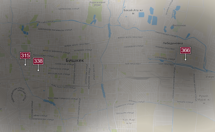 - в районе улиц Бейшеналиевой/Токтогула. Уровень загрязнения превышен в 7,05 раза: PM2.5 среднесуточный — 247 мкг/м³, на момент измерения — 315 мкг/м³;