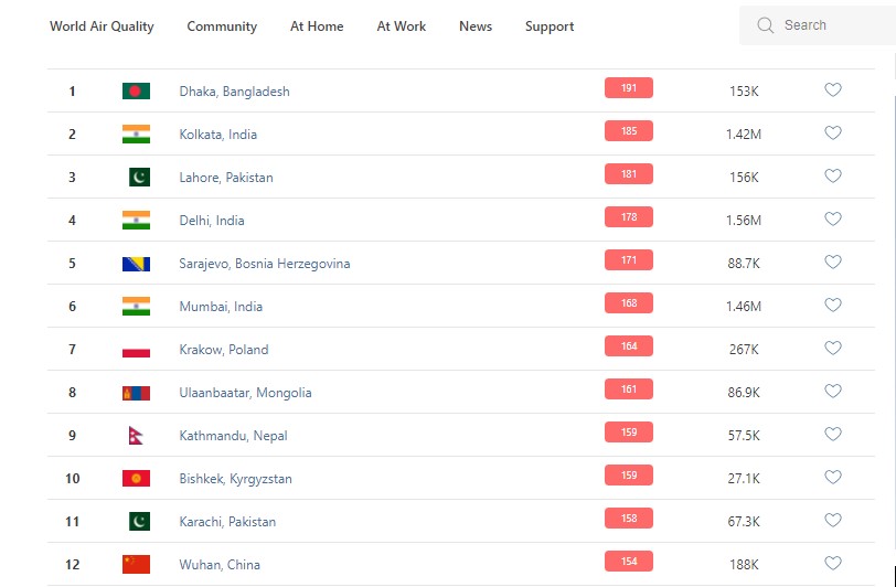 В рейтинге крупнейших городов мира по качеству воздуха World Air Quality Бишкек на 8.30 опустился на 10-е место.