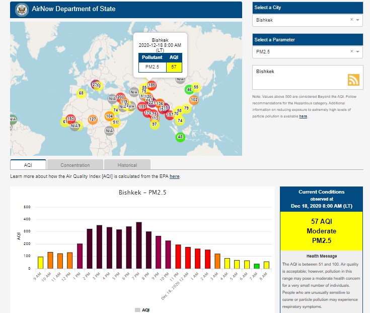 Посольство США в Кыргызстане также установило датчик. Он показывает индекс качества воздуха в режиме онлайн. Информация обновляется ежечасно.