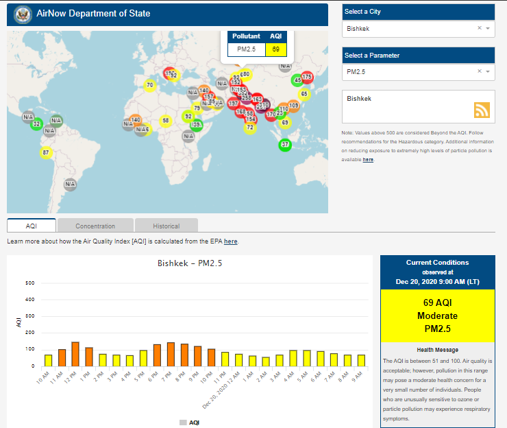 Посольство США в Кыргызстане также установило датчик. Он показывает индекс качества воздуха в режиме онлайн. Информация обновляется ежечасно.