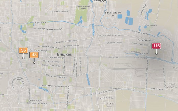 - в районе улиц Бейшеналиевой/Токтогула. Уровень загрязнения превышен в 2,4 раза: PM2.5 среднесуточный — 84 мкг/м³, на момент измерения — 55 мкг/м³;