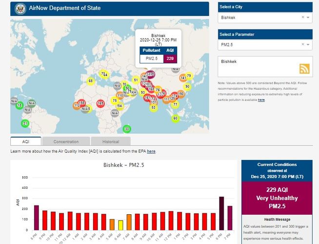 Посольство США в Кыргызстане также установило датчик. Он показывает индекс качества воздуха в режиме онлайн. Информация обновляется ежечасно.
