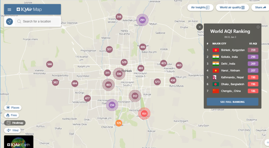 В рейтинге крупнейших городов мира по качеству воздуха World Air Quality Бишкек опять находится на первом месте.