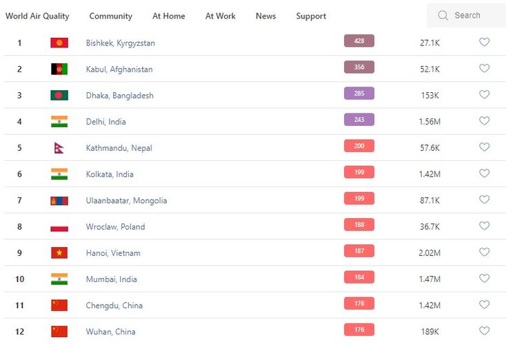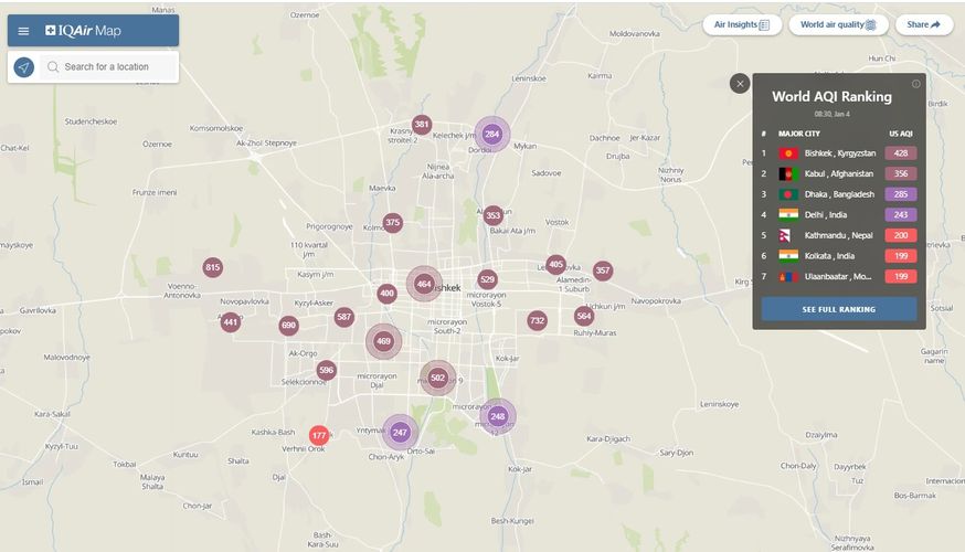 В рейтинге крупнейших городов мира по качеству воздуха World Air Quality Бишкек опять находится на первом месте.