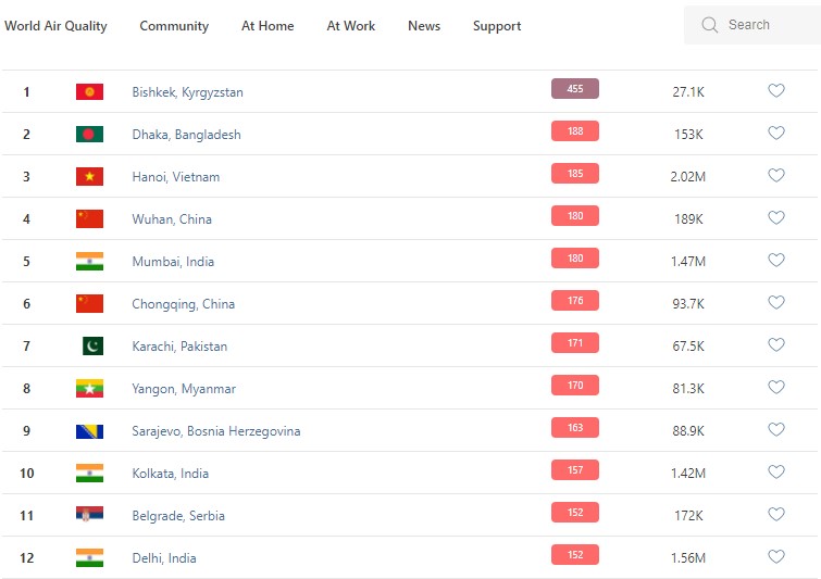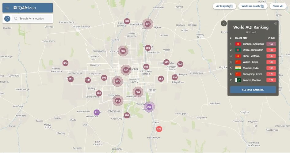 В рейтинге крупнейших городов мира по качеству воздуха World Air Quality Бишкек находится на первом месте.