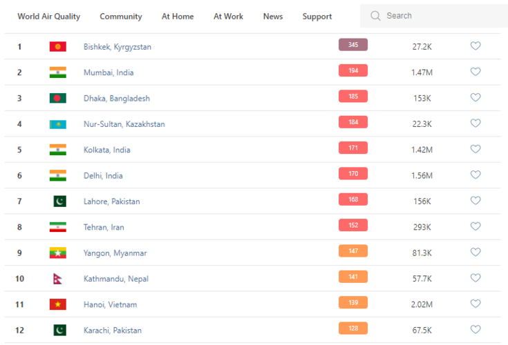 В рейтинге крупнейших городов мира по качеству воздуха World Air Quality Бишкек по-прежнему находится на первом месте.