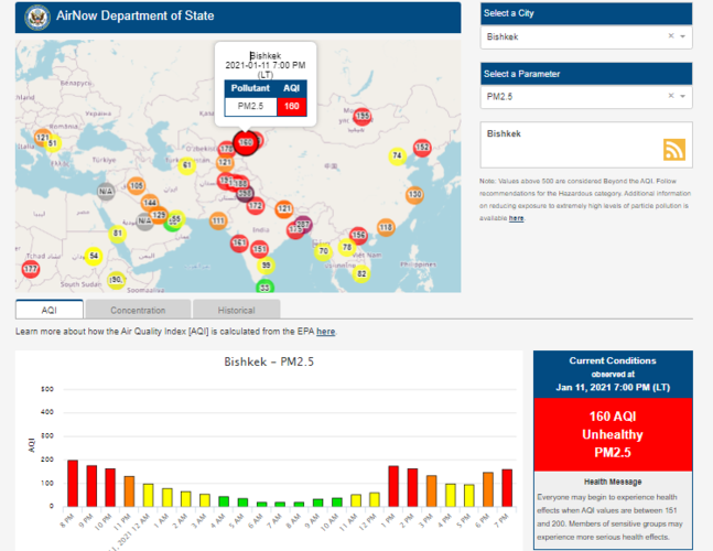 Информация обновляется каждый час. На 19.00 индекс качества воздуха в районе дипломатической миссии — 160 (AQI).