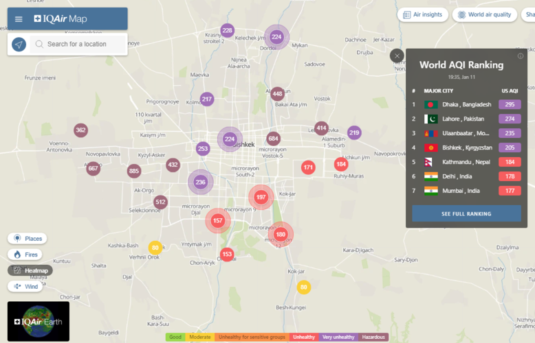 В рейтинге крупнейших городов мира по качеству воздуха World Air Quality Бишкек подялся на четвертое место.