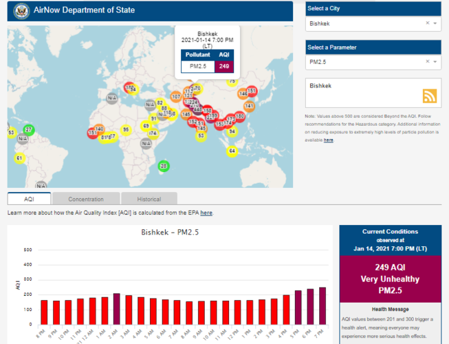 Информация обновляется каждый час. На 19.00 индекс качества воздуха в районе дипломатической миссии — 249 (AQI).