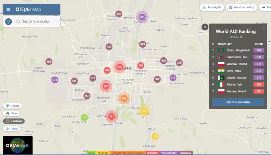 В рейтинге крупнейших городов мира по качеству воздуха World Air Quality Бишкек поднялся на 10-е место.
