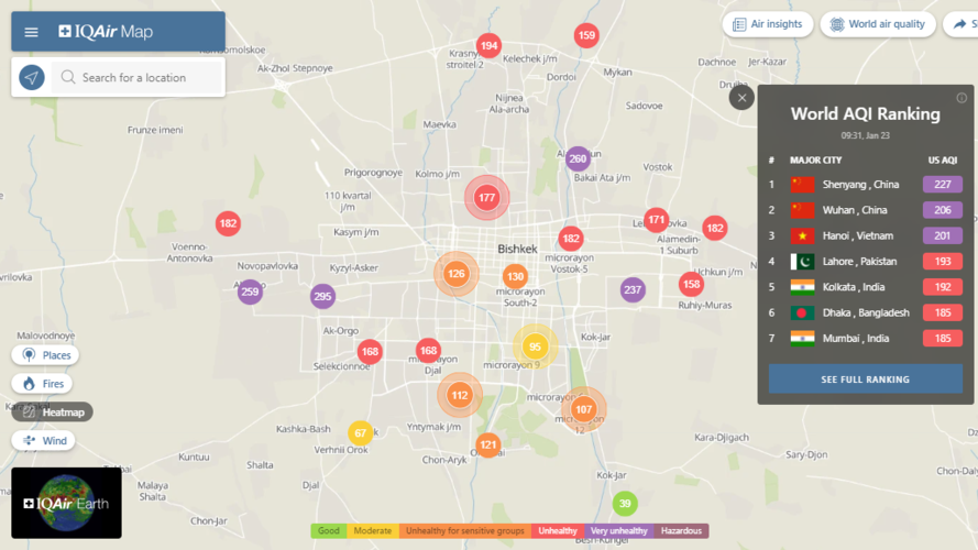 В рейтинге крупнейших городов мира по качеству воздуха World Air Quality Бишкек поднялся на 17-е место.