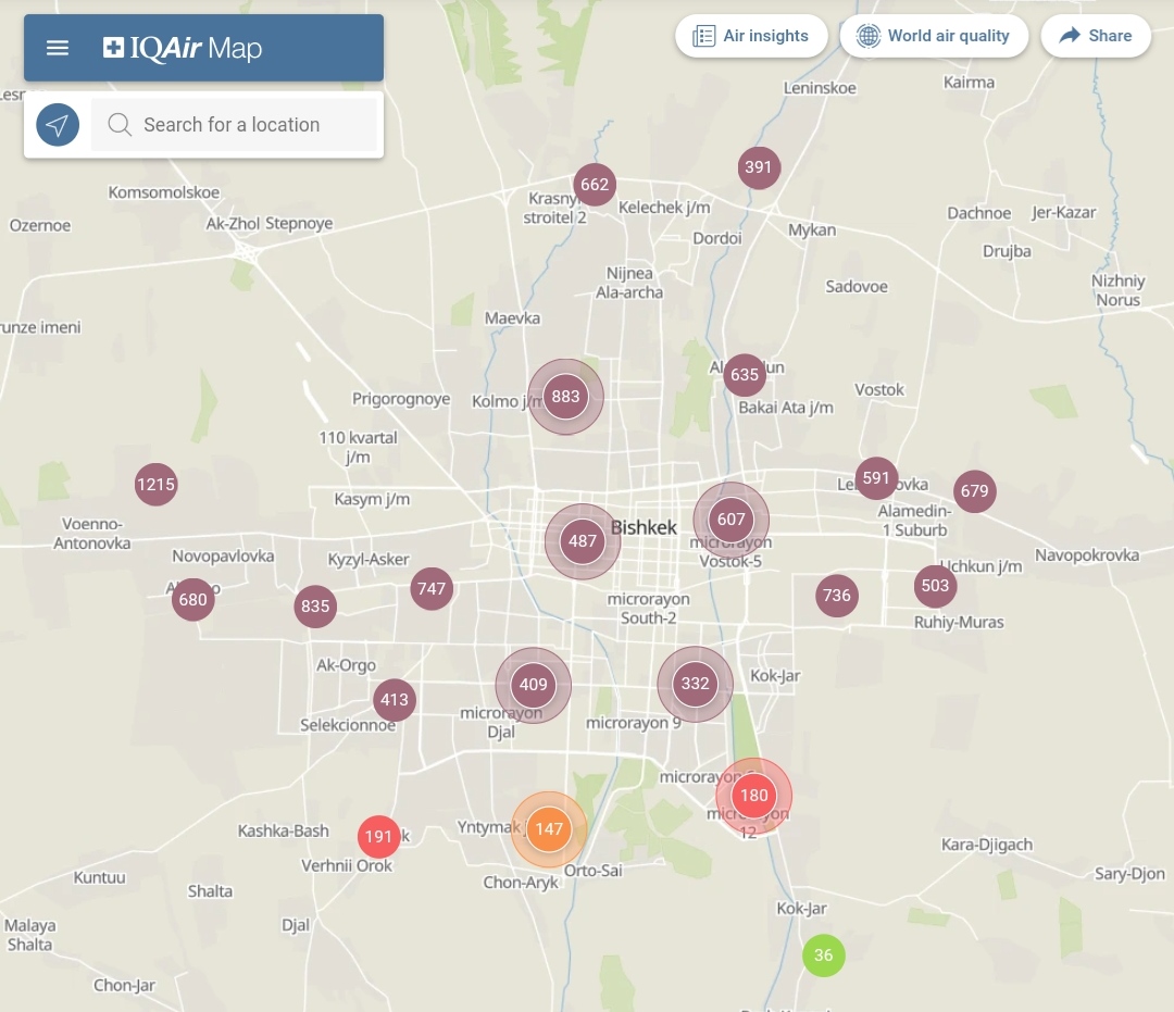 Общественный фонд «Институт экологических решений» установил датчики в столице и пригороде. На карте можно увидеть среднее значение AQI в разных районах Бишкека. Его обновляют ежечасно.