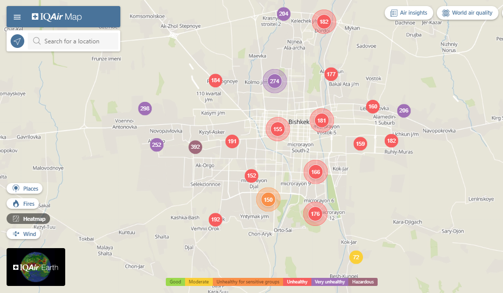 Общественный фонд «Институт экологических решений» установил датчики в столице и пригороде. На карте можно увидеть среднее значение AQI в разных районах Бишкека. Его обновляют ежечасно.