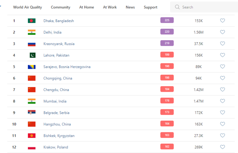В рейтинге крупнейших городов мира по качеству воздуха World Air Quality Бишкек поднялся на 11-е место.