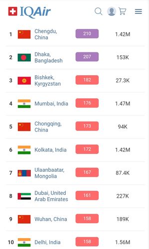 В 19.30 статус города отмечен как «нездоровый для чувствительных групп». Индекс качества воздуха, по данным сайта, составляет 182 (AQI).