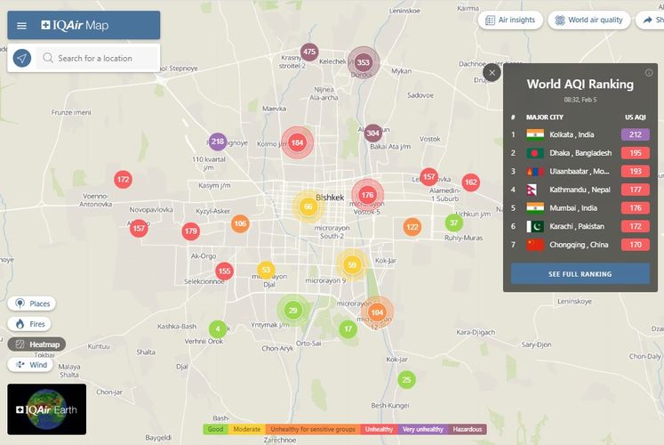 В рейтинге крупнейших городов мира по качеству воздуха World Air Quality Бишкек опустился на 62-е место.