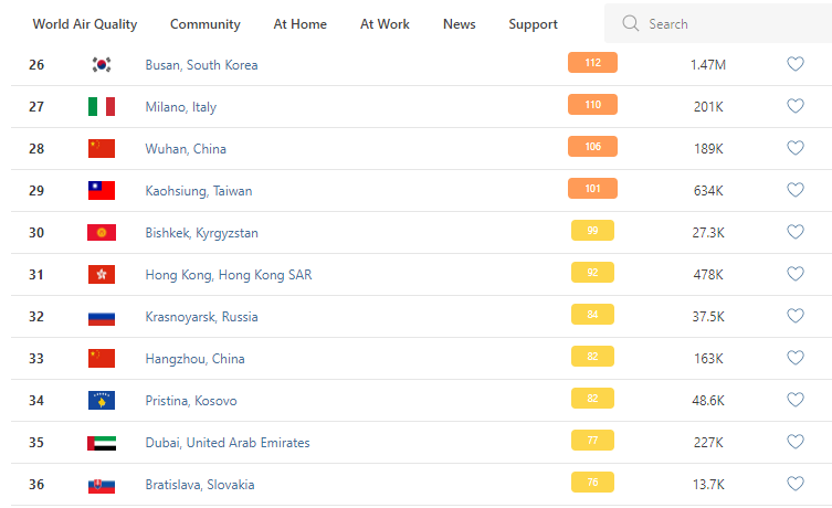 В рейтинге крупнейших городов мира по качеству воздуха World Air Quality Бишкек поднялся на 30-е место.