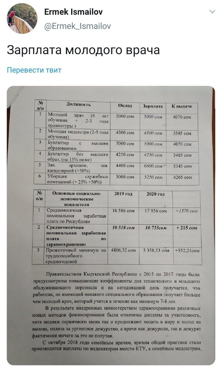 Врач Эрмек Исмаилов в своем блоге в Twitter поделился документом, где указана заработная плата медработников в Кыргызстане.