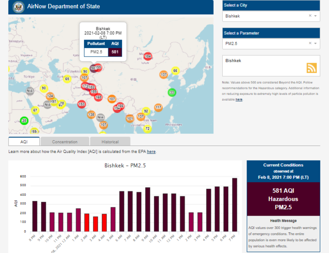 Посольство США в Кыргызстане также установило датчик. Информация обновляется каждый час. На 19.00 индекс качества воздуха в районе дипломатической миссии — 581 (AQI).