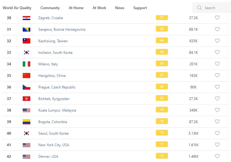 В рейтинге крупнейших городов мира по качеству воздуха World Air Quality Бишкек опустился на 37-е место.