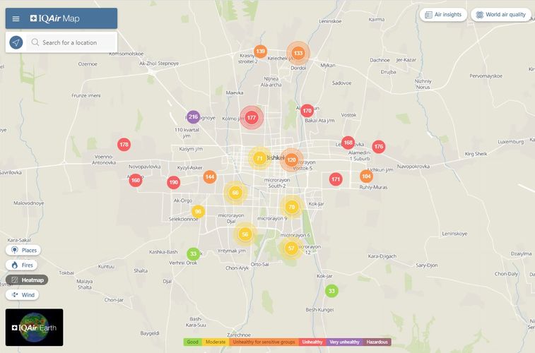 Общественный фонд «Институт экологических решений» установил датчики в столице и пригороде. На карте можно увидеть среднее значение AQI в разных районах Бишкека. Его обновляют ежечасно.