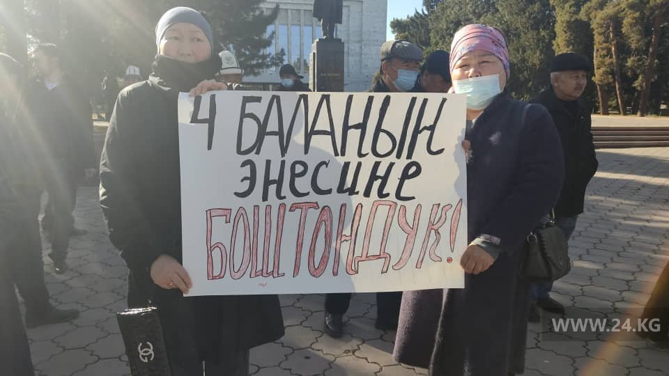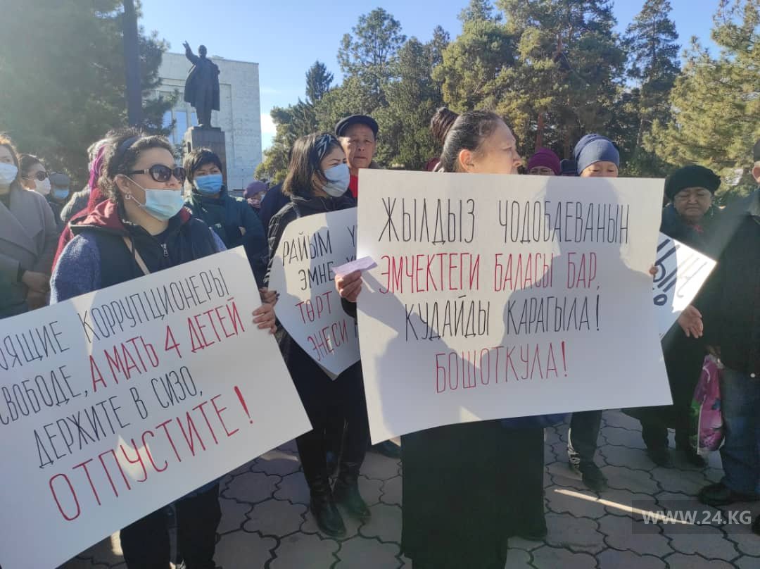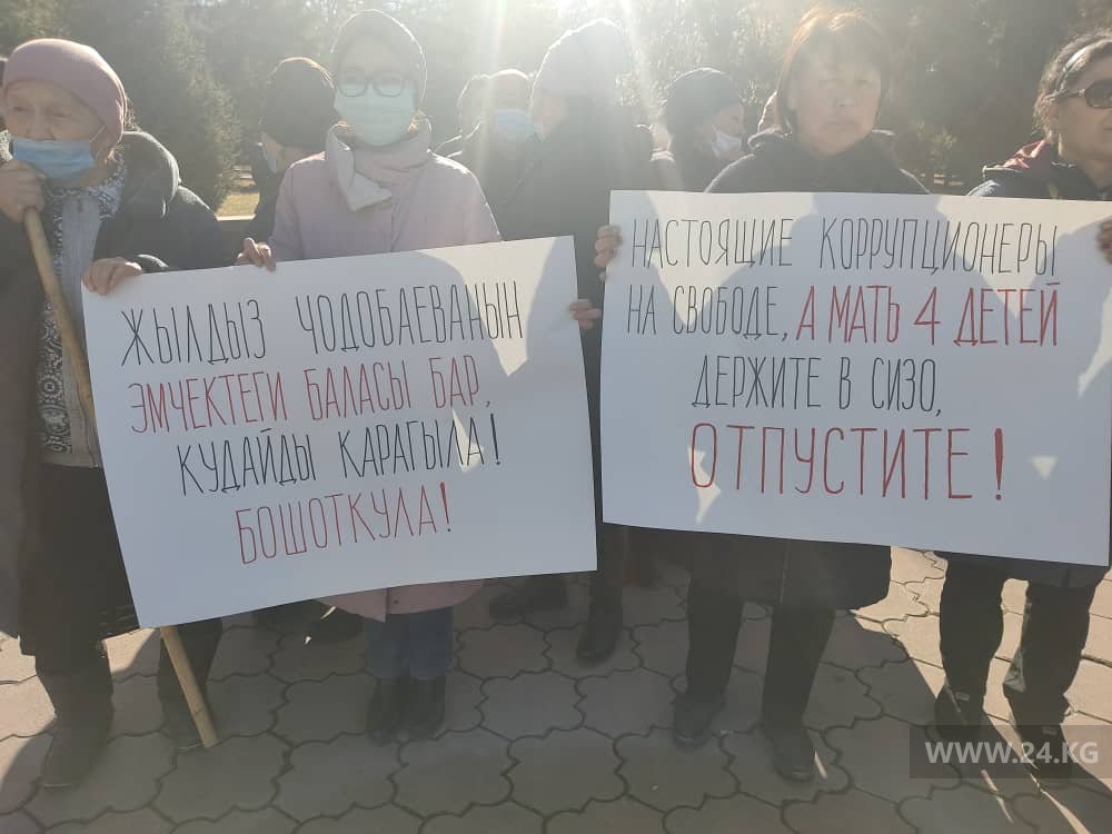 Участники акции требуют отпустить ее из-под стражи. Они указывают, что у Жылдыз Чодобаевой маленькие дети, в том числе грудной ребенок.
