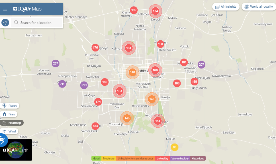 Общественный фонд «Институт экологических решений» установил датчики в столице и пригороде. На карте можно увидеть среднее значение AQI в разных районах Бишкека. Его обновляют ежечасно.