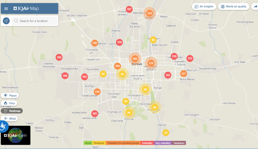 Общественный фонд «Институт экологических решений» установил датчики в столице и пригороде. На карте можно увидеть среднее значение AQI в разных районах Бишкека. Его обновляют ежечасно.